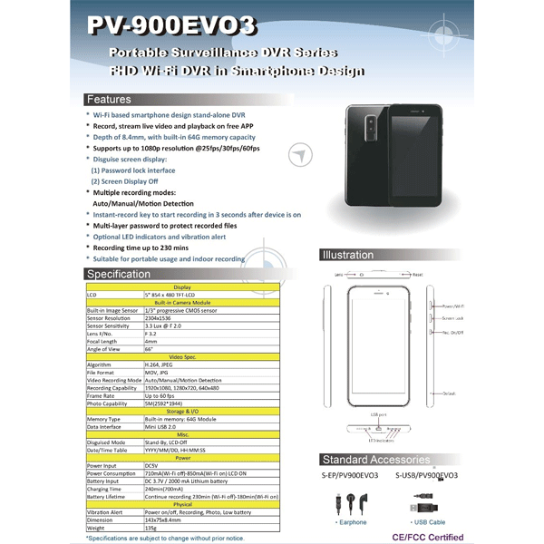 The PV-900EVO3 has been designed to look like a smartphone, with a Wi-Fi enabled DVR system for recording video and audio covertly.